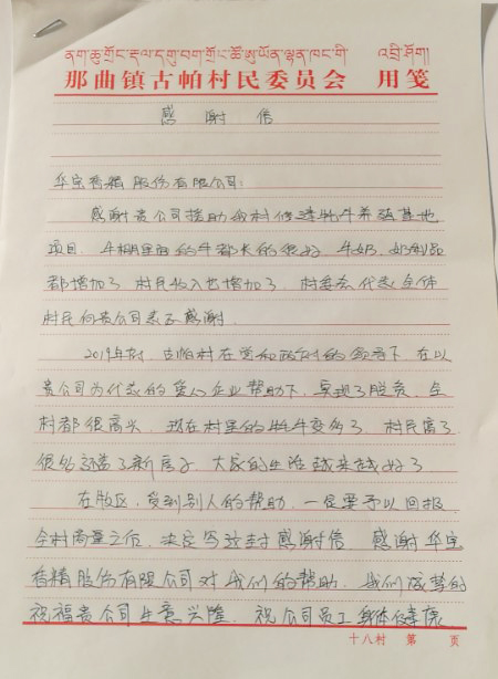 在牧區,收到別人的幫助,一定要予以回報,全村商量之后,決定寫(xiě)這封感謝信,感謝華寶香精股份有限公司對我們的幫助,我們誠摯的祝福貴公司生意興隆,祝公司員工身體健康、萬(wàn)事如意、扎西德勒!