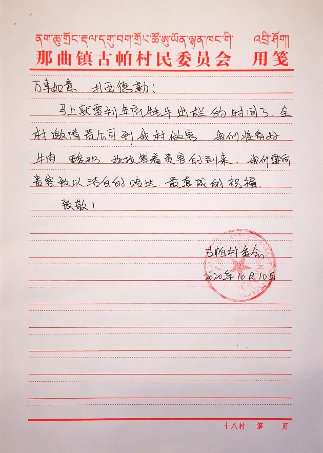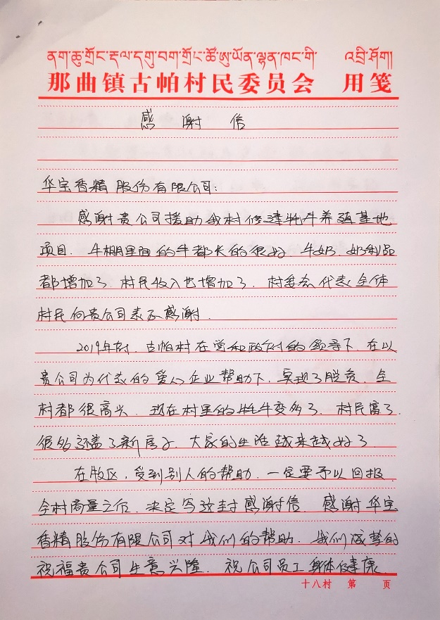 西藏那曲古帕村村民給華寶股份寫(xiě)親筆感謝信