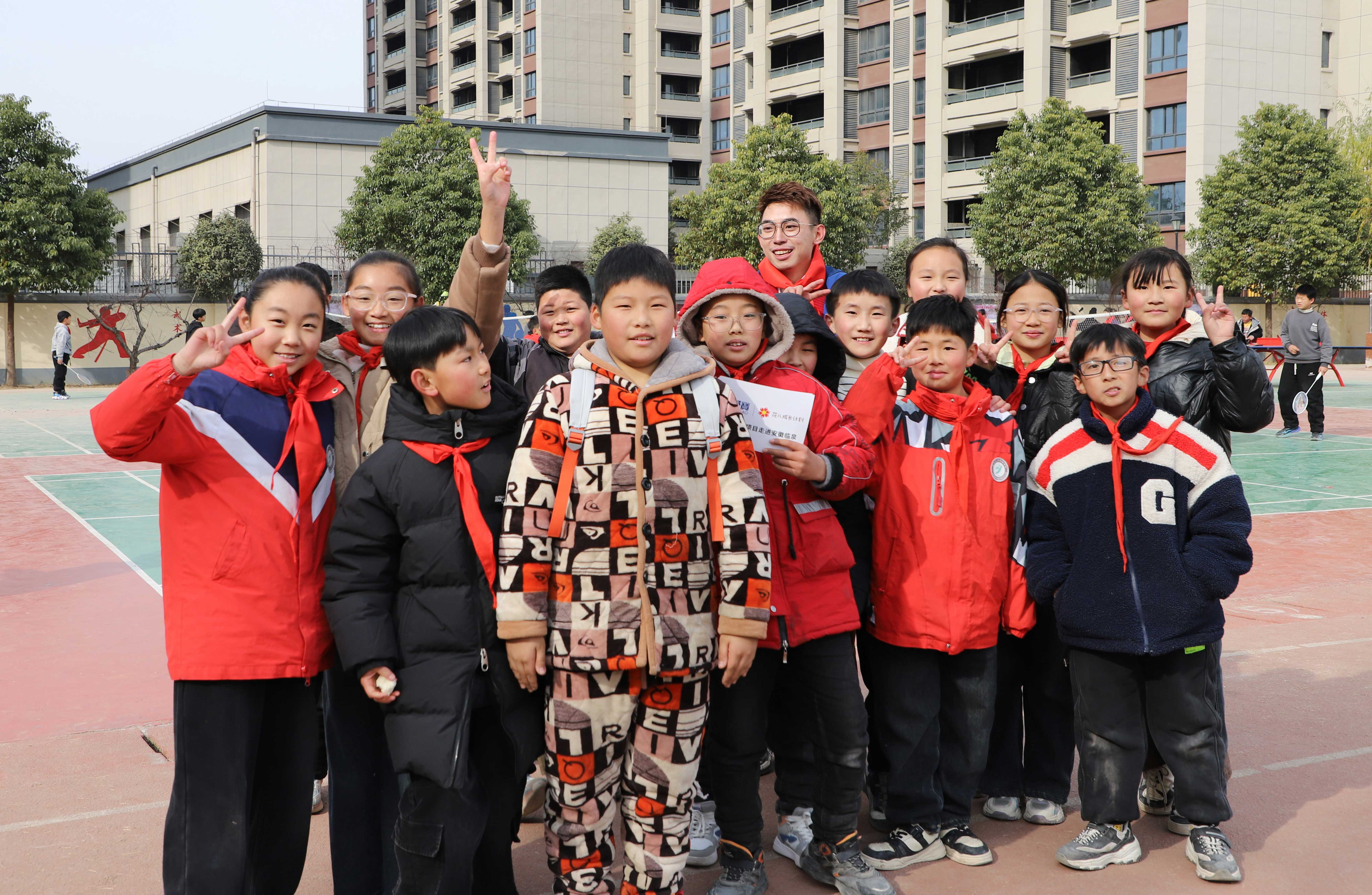 在官方捐贈儀式結束后,我前去操場(chǎng)和學(xué)生們互動(dòng)。一位扎著(zhù)俏皮馬尾、眼眸亮若星辰的“三道杠”小孩姐,仿若春日云雀,歡快輕盈地蹦跳到我跟前,小手拽著(zhù)我的衣角,奶聲奶氣卻又擲地有聲:“叔叔,我們是光榮的少先隊員,可以給我們拍張照嘛?”