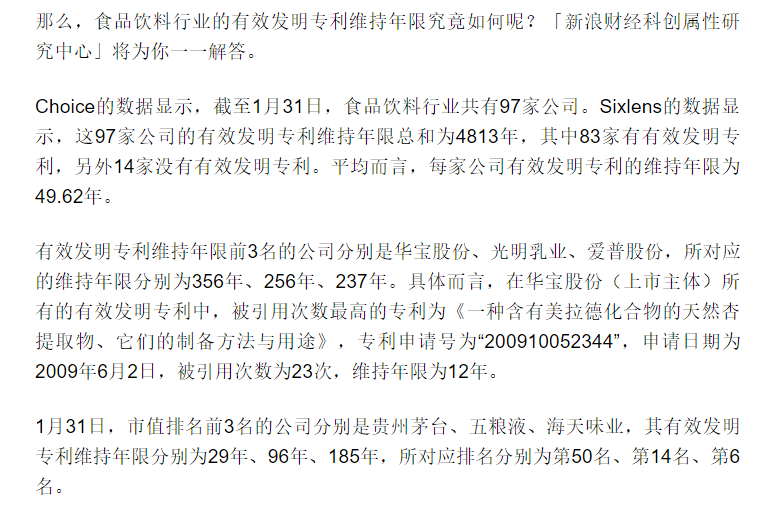近日,新浪財經(jīng)發(fā)表了一篇關(guān)于“食品飲料業(yè)有效發(fā)明專(zhuān)利維持年限排行”的文章(《食品飲料業(yè)有效發(fā)明專(zhuān)利維持年限排行:華寶股份第一》),在食品飲料業(yè)有效發(fā)明專(zhuān)利維持年限中,華寶股份名列第一。“有效發(fā)明專(zhuān)利維持年限分布反映了公司專(zhuān)利資產(chǎn)的屬性分布情況,尤其是長(cháng)時(shí)間維持的有效發(fā)明專(zhuān)利數量反映了公司所擁有的優(yōu)質(zhì)專(zhuān)利資產(chǎn)情況。”文中寫(xiě)道。